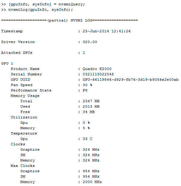 Informations sur la carte graphique NVIDIA avec MATLAB et le NVIDIA System Management Interface